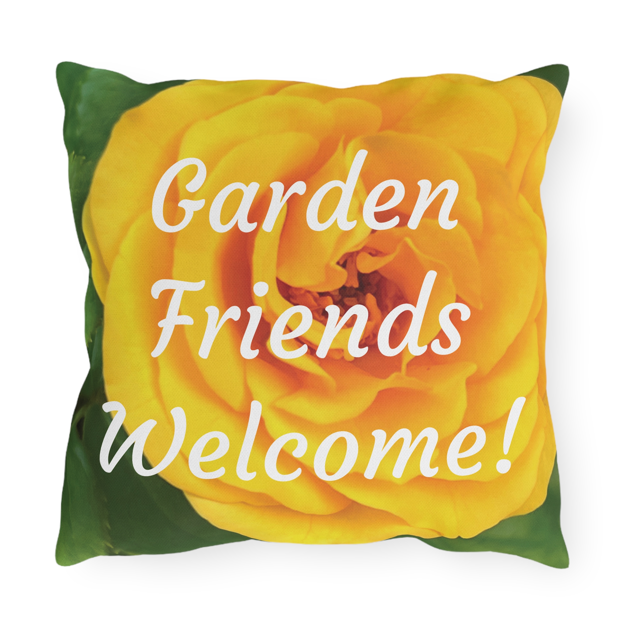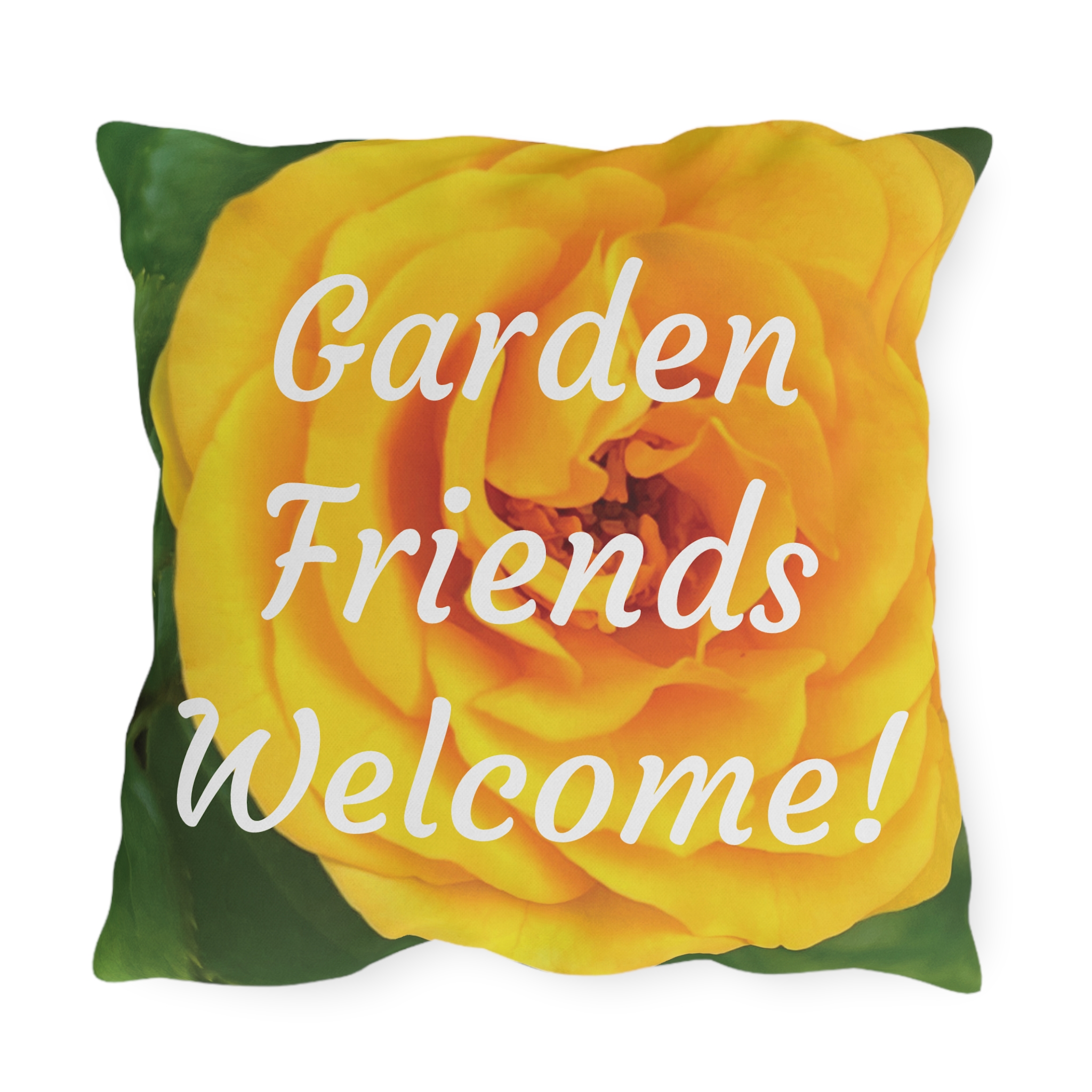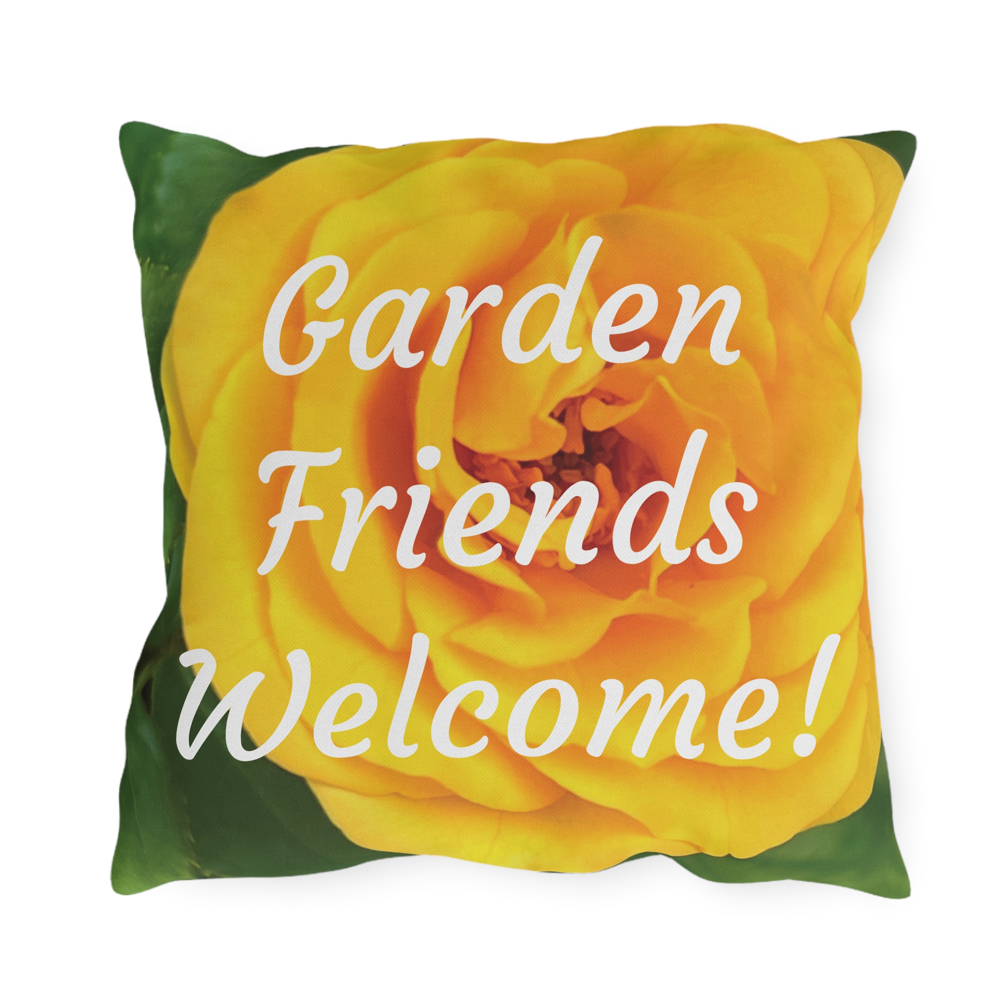 Transform your garden or patio into a welcoming retreat with our vibrant “Yellow Rose ‘Garden Friends Welcome’ Outdoor Patio Pillows.” Designed for those who love to blend comfort with charm, these pillows feature a stunning yellow rose print from Heather’s garden on both sides, making them a perfect accent for any outdoor setting.