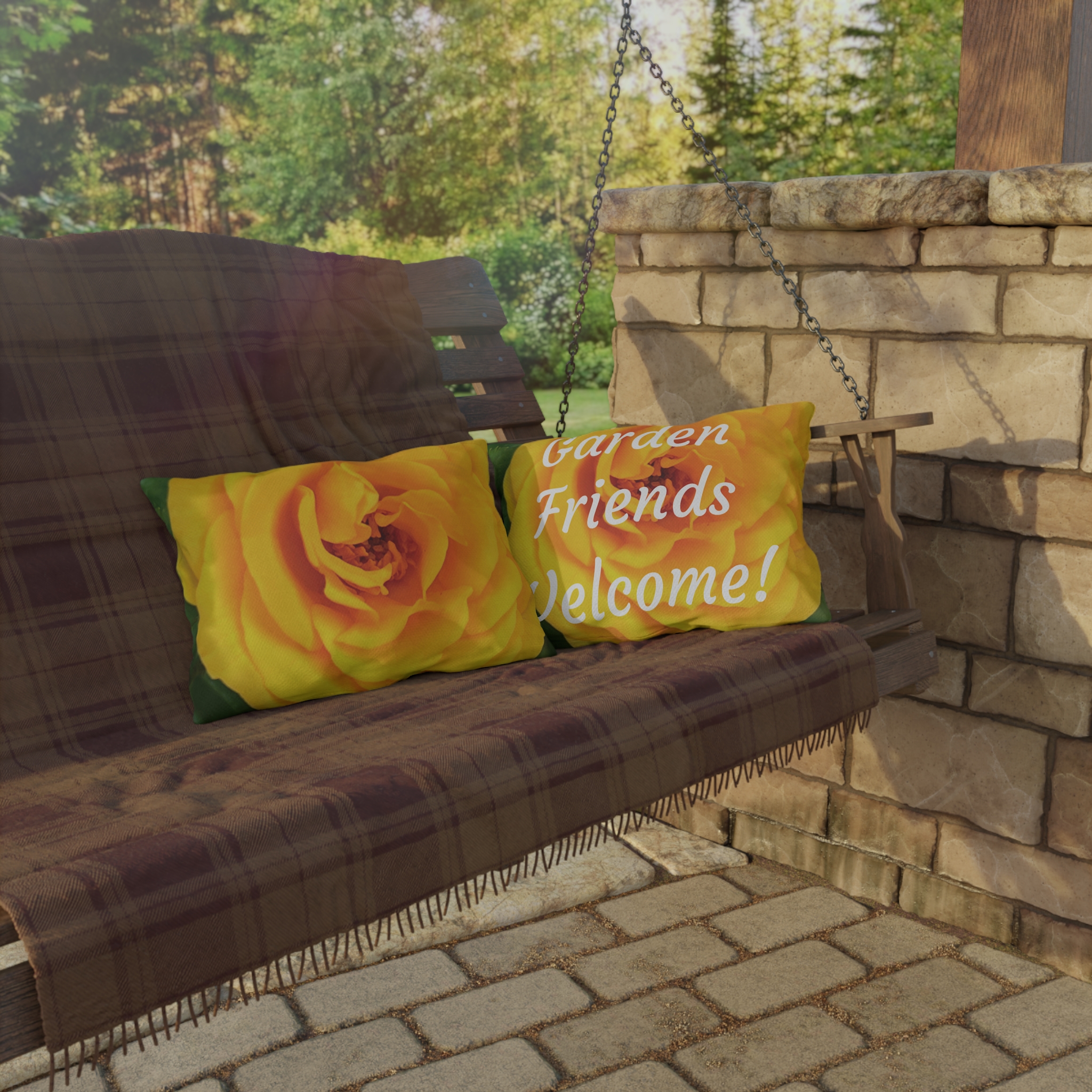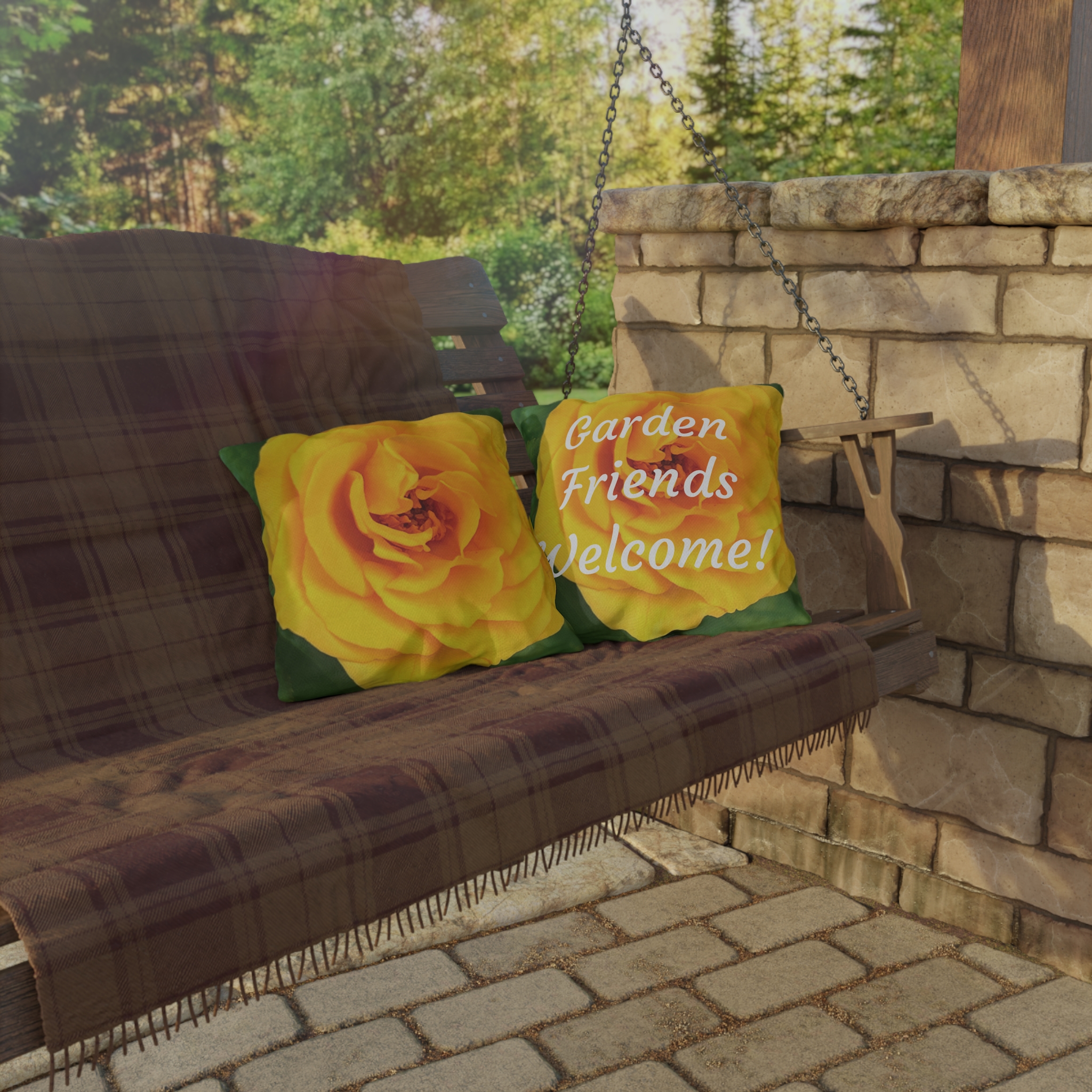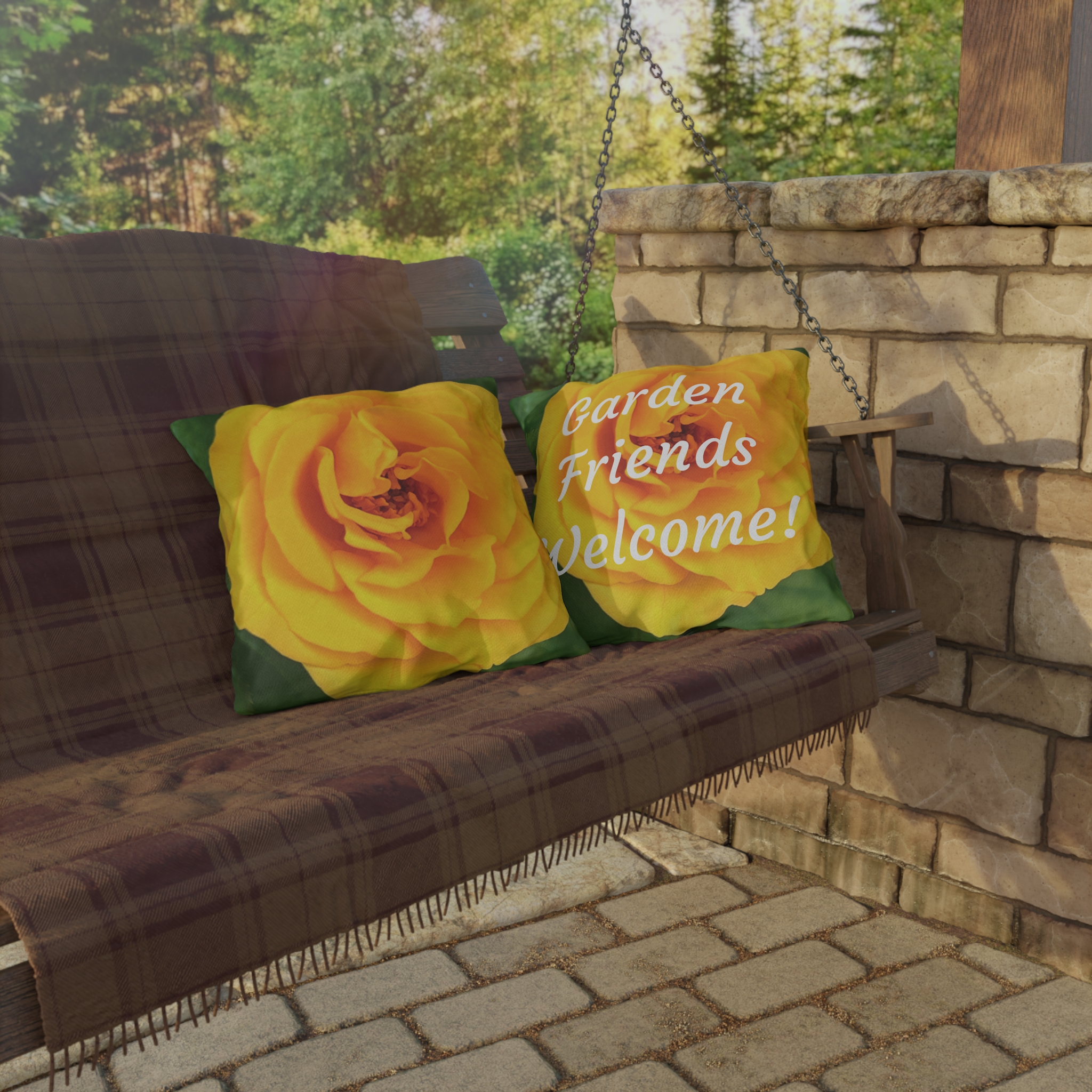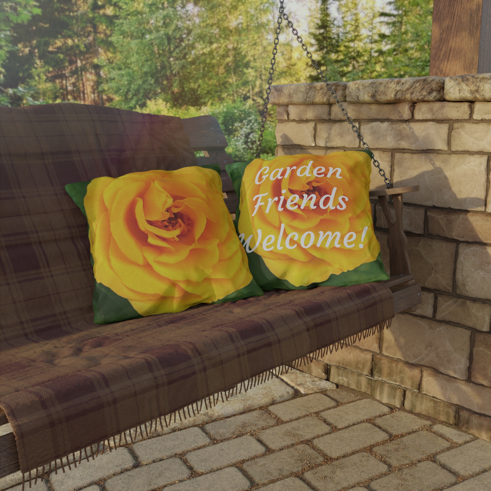 Transform your garden or patio into a welcoming retreat with our vibrant “Yellow Rose ‘Garden Friends Welcome’ Outdoor Patio Pillows.” Designed for those who love to blend comfort with charm, these pillows feature a stunning yellow rose print from Heather’s garden on both sides, making them a perfect accent for any outdoor setting.